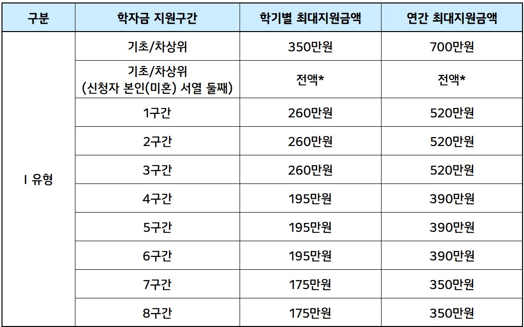 학자금 지원구간별로 해당 학기 등록금 필수경비(입학금, 수업료)를 초과하지 않는 범위 내에서 차등 지원
