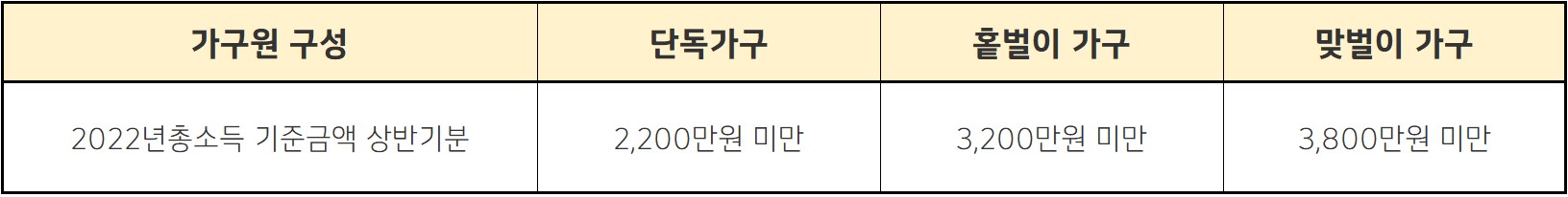 2021년 부부합산 연간 총소득 합계액 및 2022년 부부합산 연간 근로소득 합계액이 가구원 구성에 따라 정한 아래 총소득 기준금액 미만이어야 합니다.