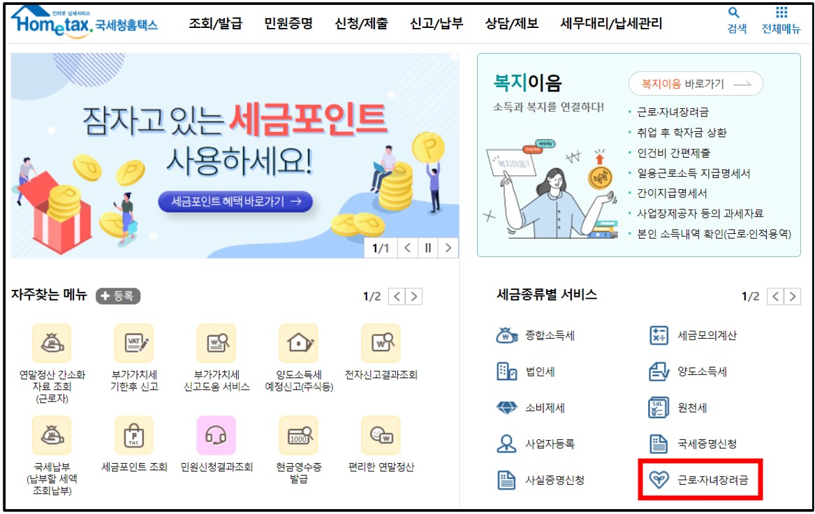 01 국세청홈택스 홈페이지 메인화면에서 [근로·자녀장려금] 클릭