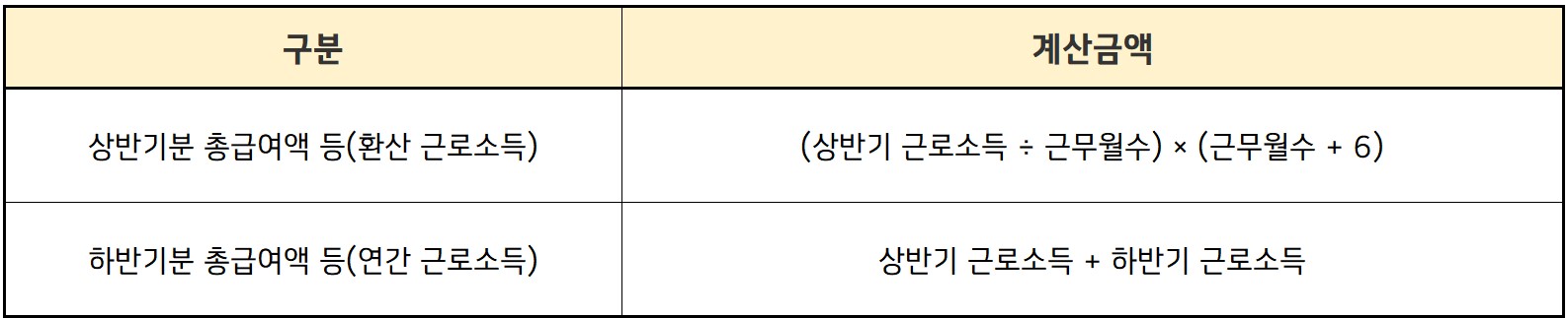 일용근로자나 중도퇴직한 상용근로자는 실제 근무월수와 무관하게 근무월수를 6개월로 봅니다.