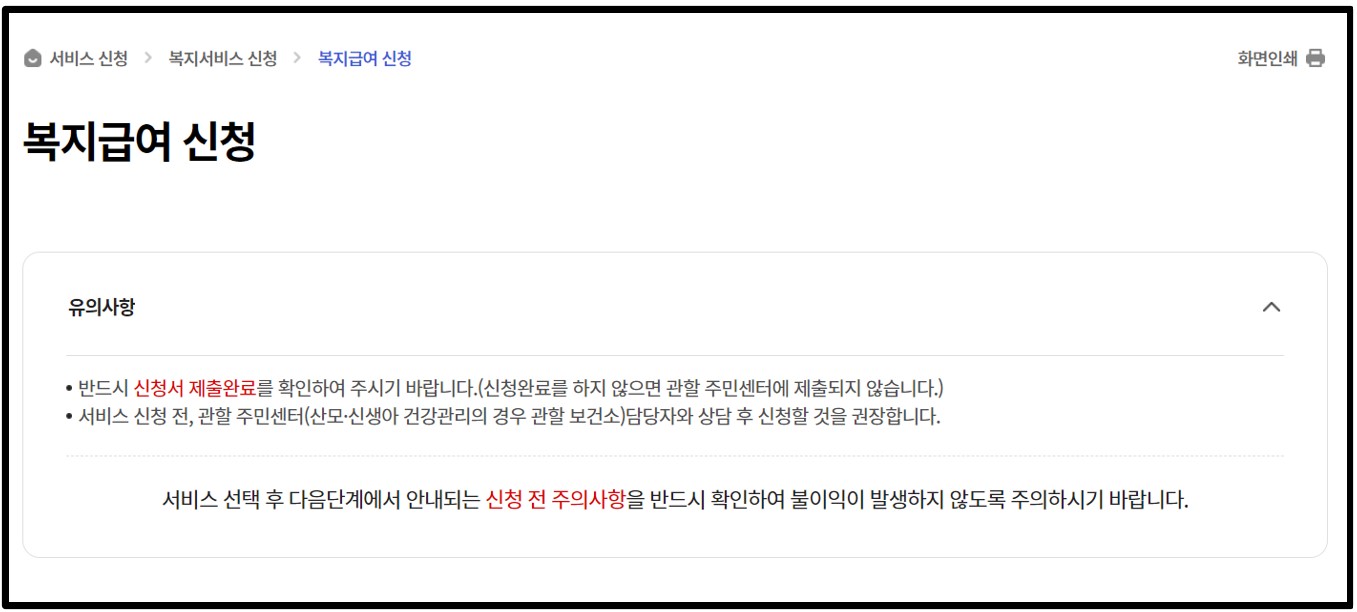 03 신청 전 유의사항 확인 후 확인버튼 선택 → 복지서비스 신청 기본정보 빠짐없이 입력 → 마지막 단계(4단계)에서 제출버튼 선택