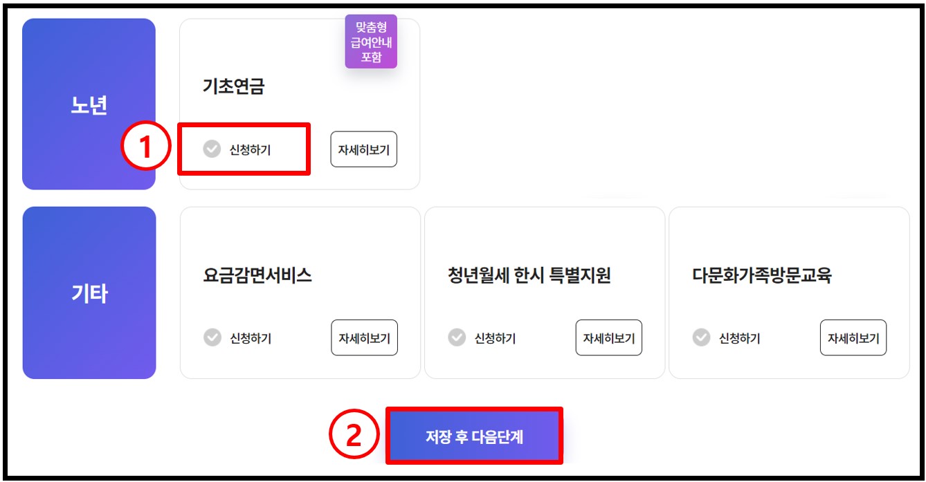 02 복지급여 신청 화면에서 아래로 드래그 → 기초연금 신청하기 체크 → 저장 후 다음단계 선택