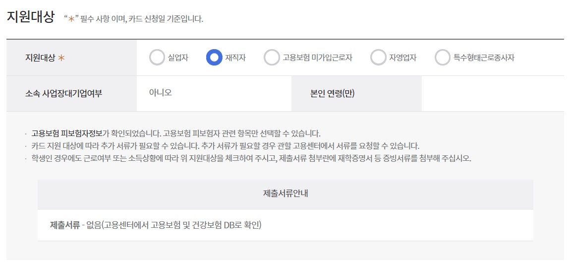 카드 발급이후 고용형태가 변경된 분들은 지원대사잉 변경되지 않아 인터넷 원격과정(온라인과정)의 수강신청이 안될 수 있으니 관할고용센터에 문의하시어 변경요청 해주시기 바랍니다.