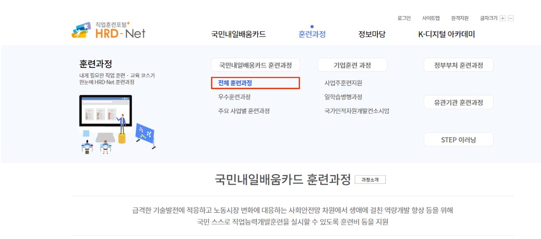 01 직업훈련포털 홈페이지 메인화면에서 훈련과정 → 전체 훈련과정 선택