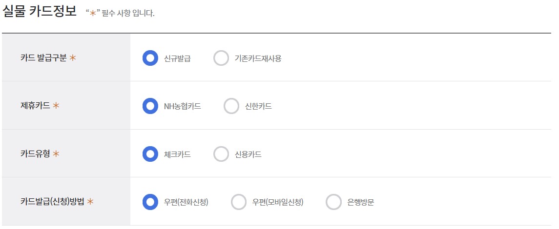 - 모바일신청 : 신청인이 선택한 제휴카드사(NH농협카드, 신한카드)의 모바일 서비스를 통해 카드 발급을 신청