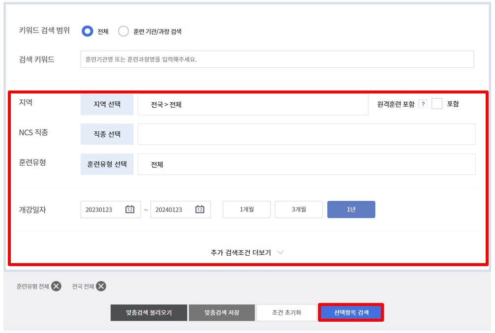 02 지역별/직종별/훈련유형별 선택 후 → 선택항목 검색 선택