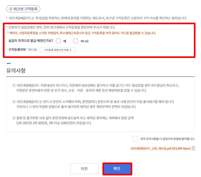 ○ 워크넷 구직등록여부 확인을 위해 실업자 여부 선택 → 실업상태일 경우 워크넷에 구직등록 필수