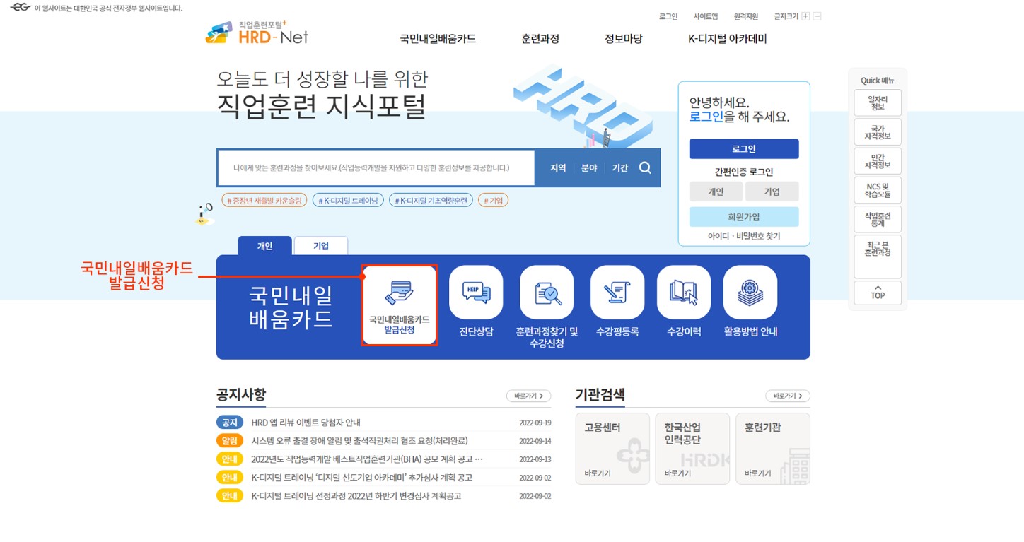 01 직업훈련포털 홈페이지 로그인 후 메인화면에서 국민내일배움카드 발급신청 선택