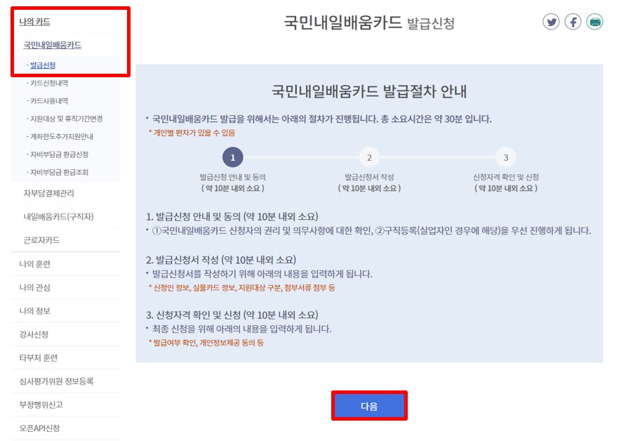 02 로그인 후 나의 정보 페이지 → 나의 카드 → 국민내일배움카드 → 발급신청 → 유의사항 확인 후 다음 선택