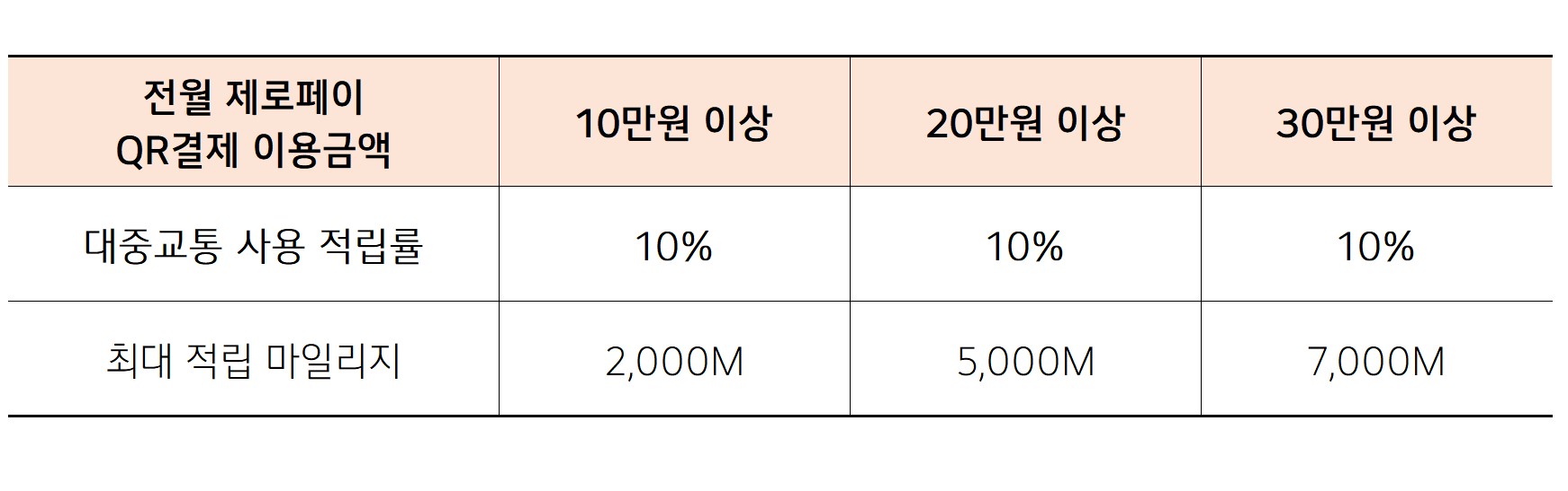 □ 전월 제로페이 가맹점 QR결제 이용금액을 기준으로 제로페이 X 알뜰교통카드로 결제하신 대중교통 이용금액의 10%를 T마일리지로 적립해드립니다.