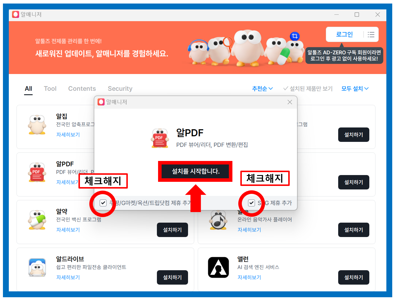 2. 체크 해지 후에 '설치를 시작합니다' 버튼을 클릭 후, 설치가 완료되면 마침 버튼을 눌러 설치를 종료합니다.