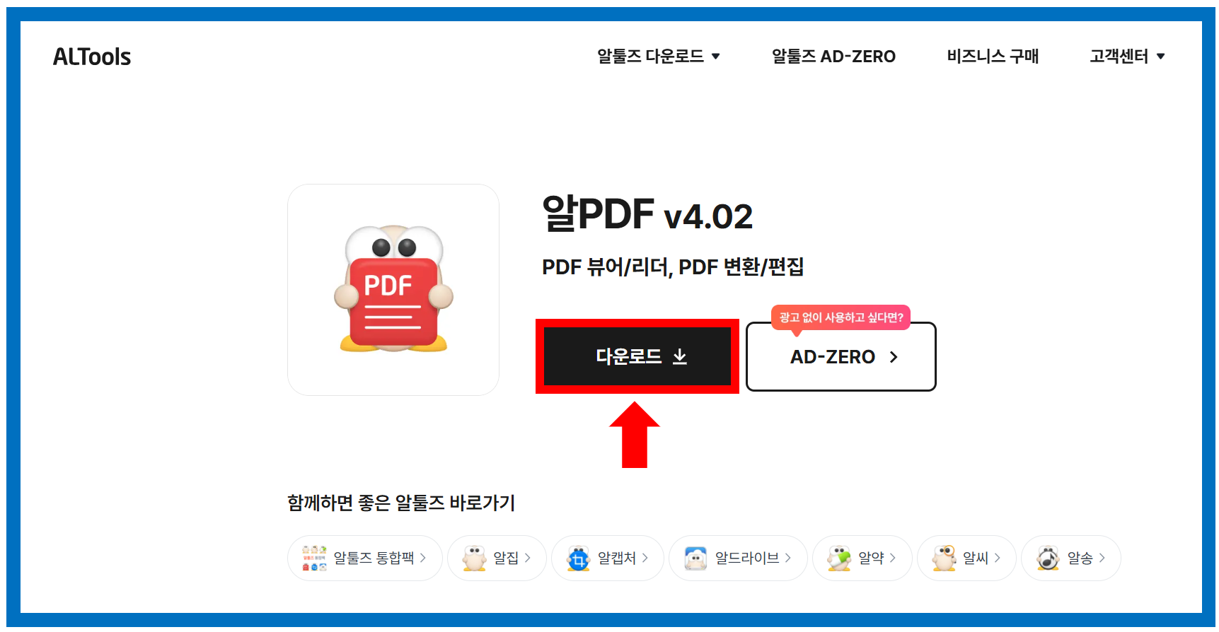 알툴즈 공식 웹사이트(https://altools.co.kr/product/ALPDF)에 접속하여, 다운로드 버튼을 클릭하여 설치 파일을 저장합니다.