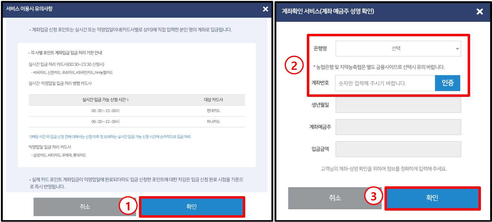 A : 카드 포인트 계좌입금 서비스 이용은 매일 00:30 ~ 23:30시에 이용이 가능하며, 카드사별 1일 1회만 계좌 입금 신청이 가능합니다.