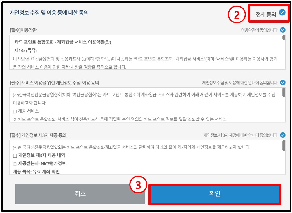 01 여신금융협회 홈페이지 접속 → 메인화면에서 카드포인트 통합조회&계좌입금 선택