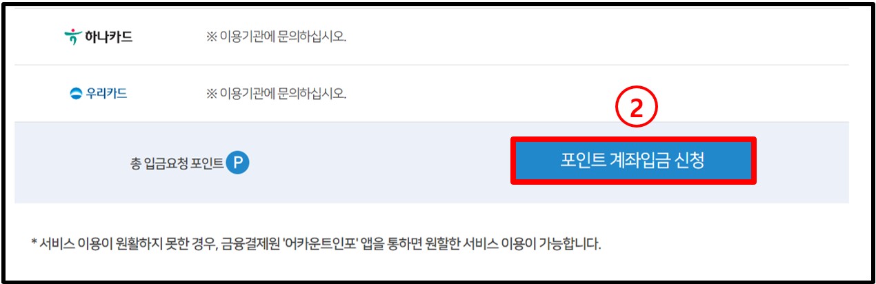 계좌입금 금액을 다시 포인트로 전환되고자 하실 경우 각 카드사에 문의하시기 바랍니다.