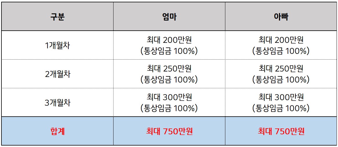 ○ 같은 자녀에 대하여 자녀 생후 12개월 내 부모가 동시에 또는 순차적으로 육아휴직을 사용하는 경우, 첫 3개월 동안 모든 개월차에 통상 임금의 100%받을 수 있음.