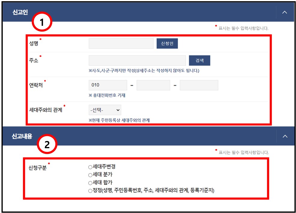 ① 신고인 성명/주소/연락처/세대주와의 관계 입력하기