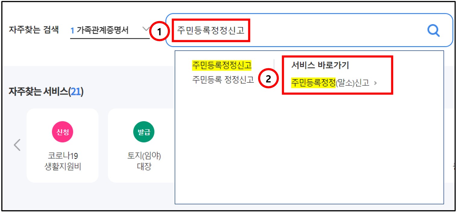 01 정부24 메인화면에서 주민등록정정신고 검색 → [주민등록정정(말소)신고] 클릭 → 민원안내 및 신청 화면에서 [신고] 클릭