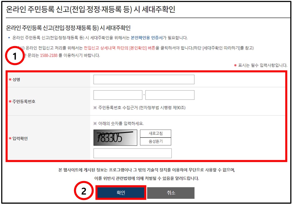 03 [성명/주민등록번호/입력확인] 작성 후 [확인]버튼 클릭 후 본인인증 후 세대주 확인