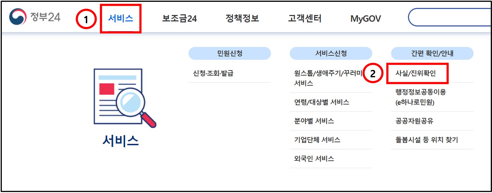 01 정부24 메인화면에서 [서비스] 클릭 → [사실/진위확인] 클릭