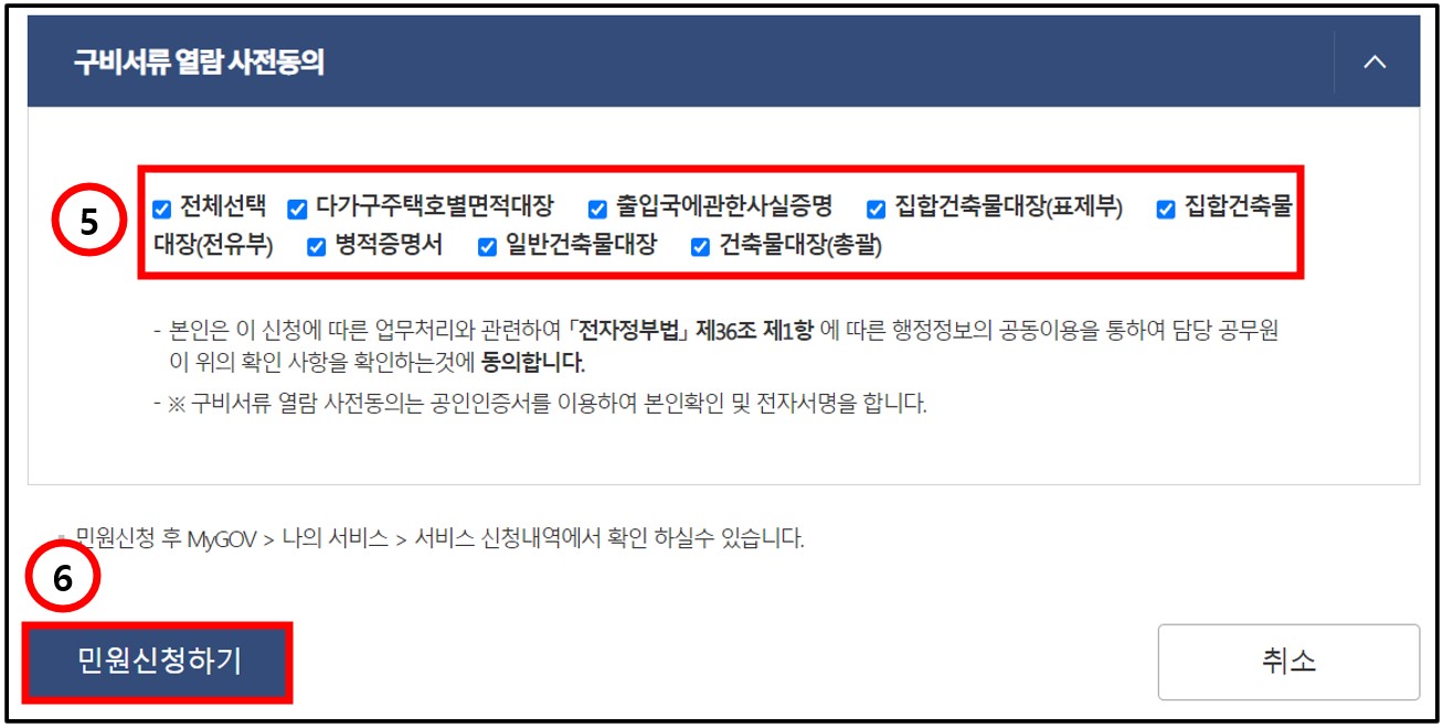 ※ 사전에 ⑤번처럼 [구비서류 열람 사전동의]를 체크하시면 민원처리기관에서 행정정보 공동이용을 통해 확인 할 수 있으므로, 별도로 제출하지 않으셔도 됩니다.