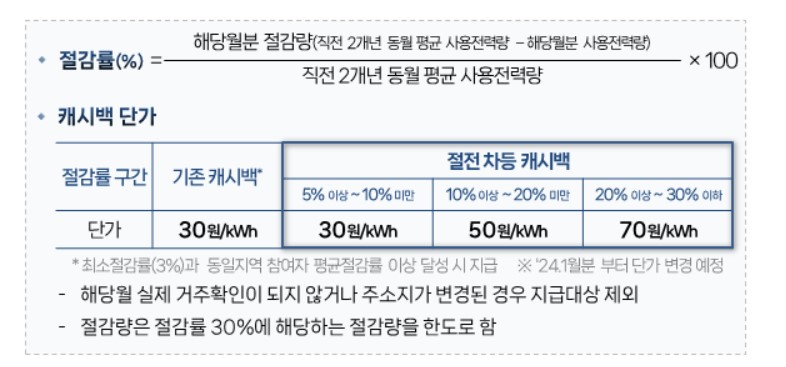 올해(2023년) 7~12월 전기사용량과 2021년, 2022년 전기사용량 평균을 비교해 최소 3%의 절감률을 달성한 주거용 주택용 전력을 사용하는 고객