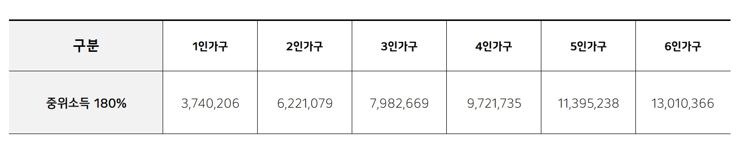 아래표는 2023년 중위소득 180% 기준이니 참고하시기 바랍니다.