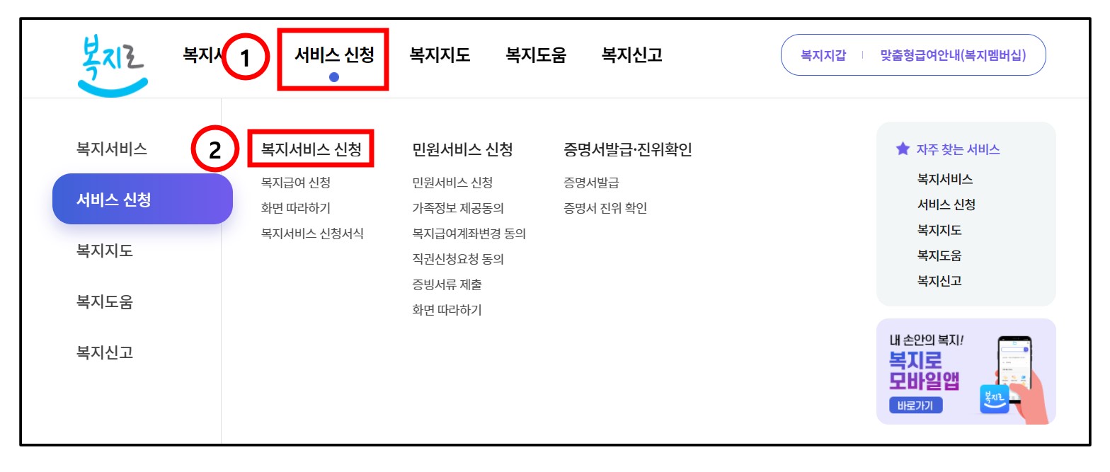 01 [서비스 신청] 클릭 → [복지서비스 신청] 클릭