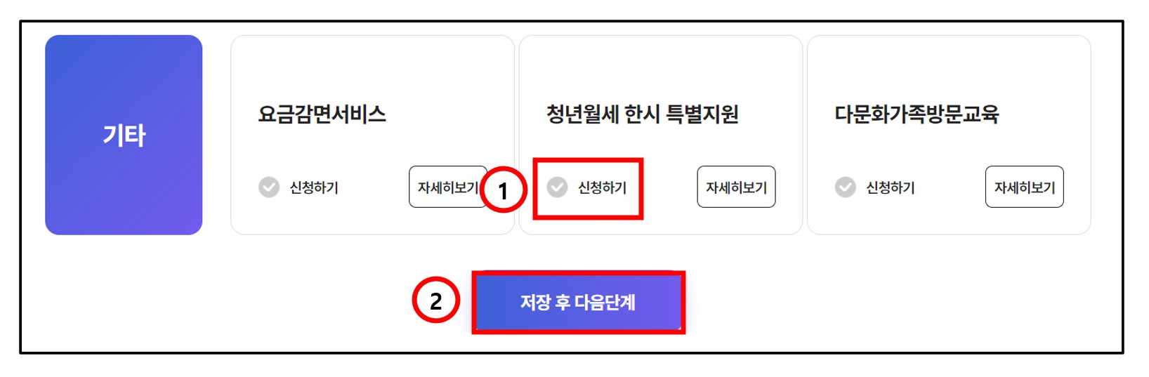 02 아래로 드래그 후 청년월세 한시 특별지원 [신청하기] 클릭 → [저장후 다음단계] 클릭