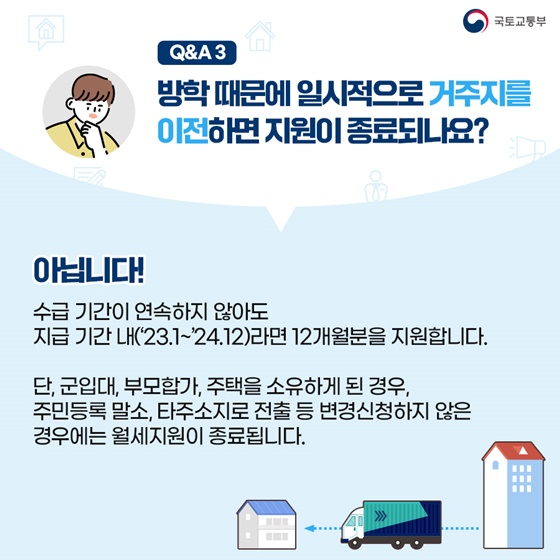 단, 군입대, 부모 합가, 주택을 소유하게 된 경우, 주민등록 말소, 타 주소지로 전출 등 변경신청하지 않은 경우에는 월세지원이 종료됩니다.
