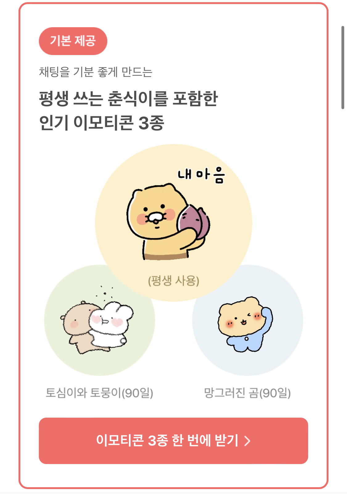 1. 카카오프렌즈 포함 인기 이모티콘 3종 지급[기본제공]