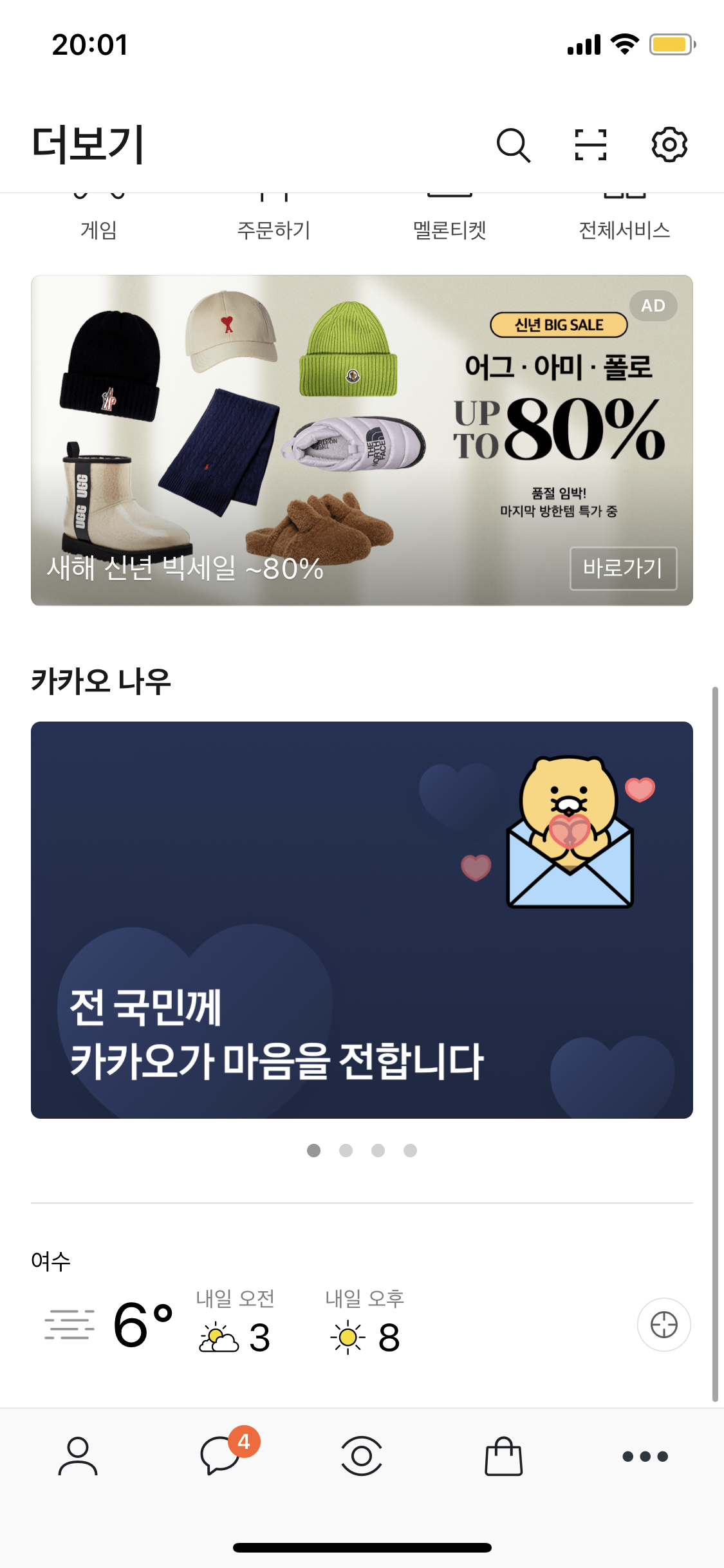1. 카카오톡 하단 아이콘 다섯개 중 맨 오른쪽 점 3개 클릭