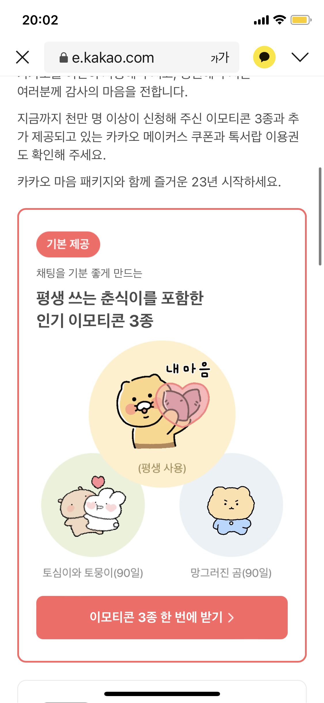 3. 클릭 후 아래로 내려서 '이모티콘 3종 한 번에 받기' 클릭