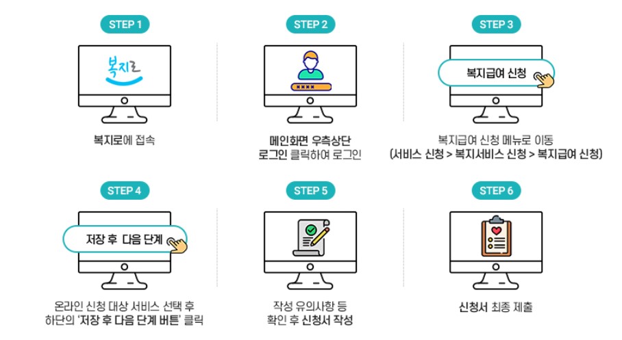 PC, 스마트폰에서 복지로 누리집 접속 또는 복지로 모바일앱에서 신청 가능합니다.
