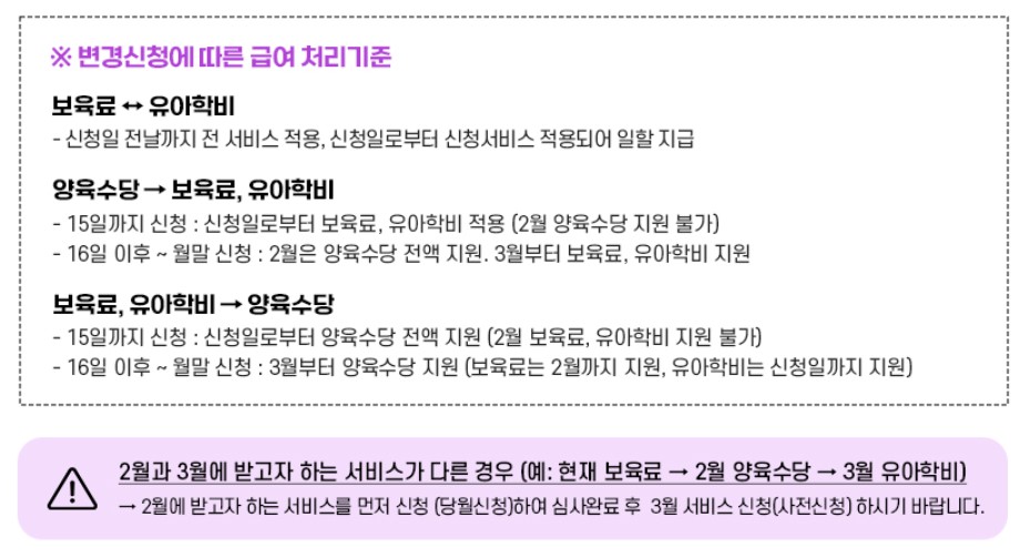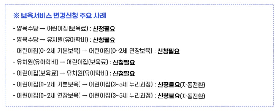 □ 자녀의 보육상황(가정양육↔어린이집↔유치원)에 따라 서비스 변경 신청이 필요함