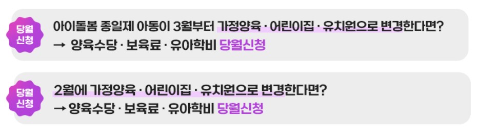 아이돌봄 종일제 아동이 3월부터 가정양육·어린이집·유치원으로 변경하거나 2월에 가정양육·어린이집·유치원으로 변경한다면 당월신청 대상자 입니다.