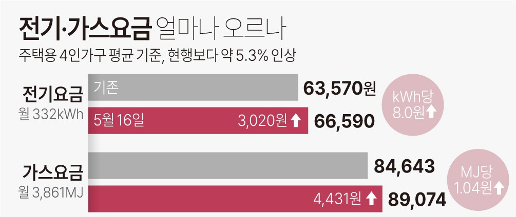 도시가스를 월 평균 3861MJ(메가줄)사용하는 4인 가구는 기존 월 8만 4643원에서 8만 9074원이 오르며 월 4,430원을 더 부담하게 되며 전기요금과 가스요금 인상으로 4인 가구 기준 월7,450원 가량을 추가 부담하게 되는 셈입니다.