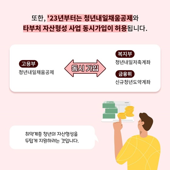 2023년에는 고용부의 청년내일채움공제와, 복지부의 청년내일저축계좌, 금융위의 신규청년도약계좌 등 타부처 자산형성 사업에 동시 가입이 허용됩니다.