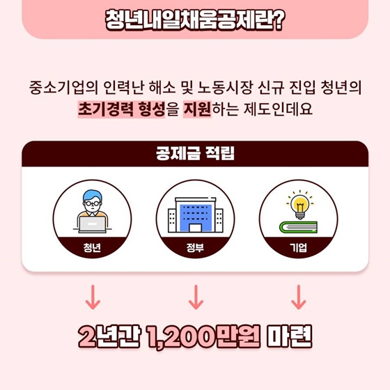 중소기업에 처음 취업한 청년을 위해 청년 근로자, 기업, 정부가 공동으로 공제부금을 적립하는 제도입니다.