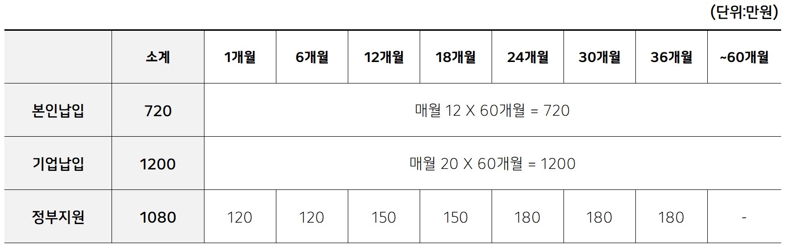 정부, 중소(중견)기업 사업주, 청년근로자(만15세 이상 ~ 34세 이하 6개월 이상 재직중인 정규직 근로자)이 공동으로 적립한 공제금을 가입기간(5년)에 따라 장기재직한 청년근로자에게 성과보상금 형태로 지급하는 공제