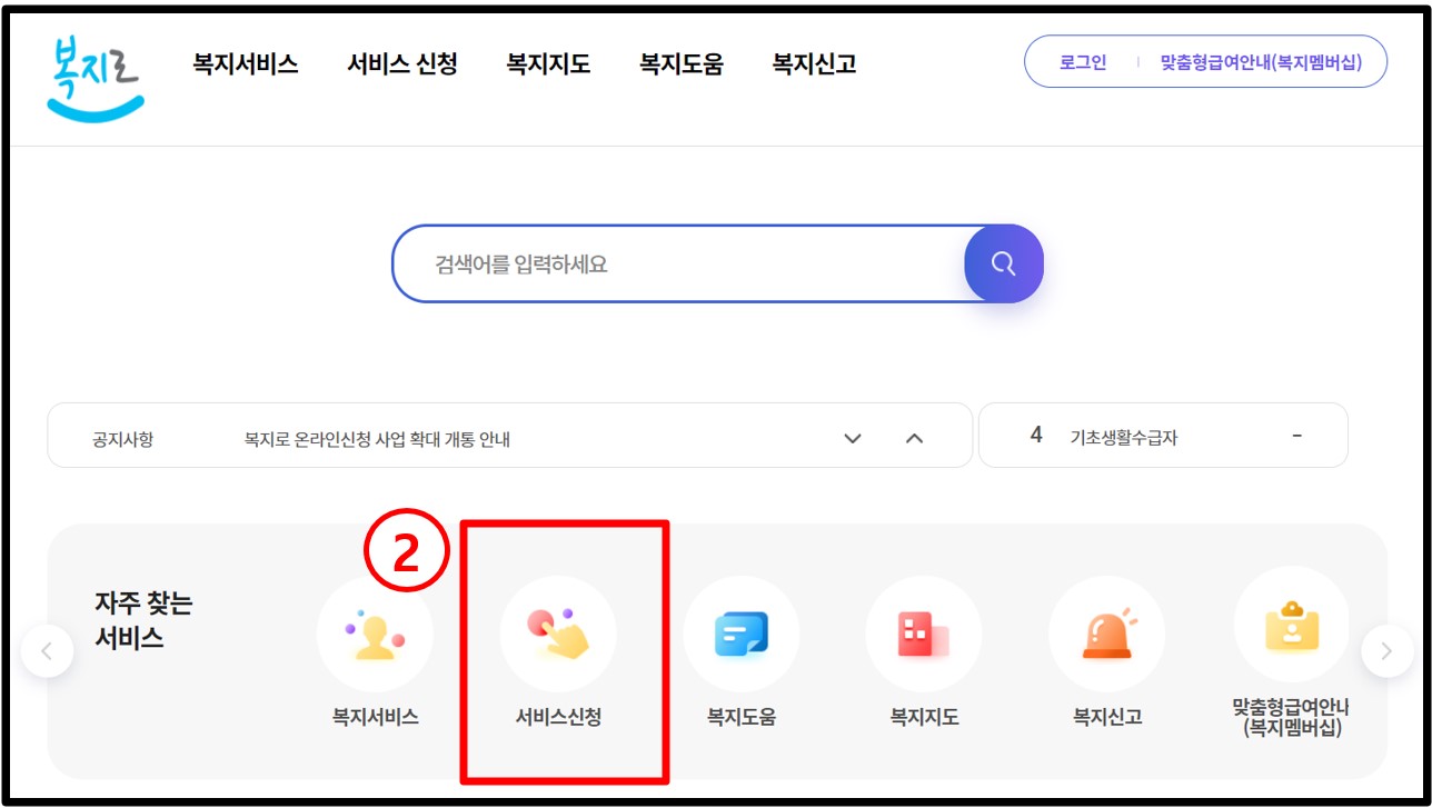 03    신청 전 유의사항 확인 후 확인버튼 선택 → 복지서비스 신청 기본정보 빠짐없이 입력 → 마지막 단계(4단계)에서 제출버튼 선택